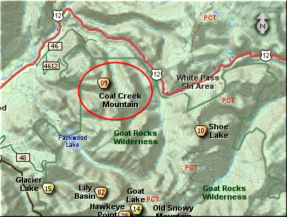 Travel east on US Hwy 12 for about 64 miles to Packwood. From Packwood head east on US Hwy 12 for about 4.5 miles. You will come to Forest Road 46 on your right. Turn right and follow FR46 for about 1.6 miles, where you will come to Forest Road 4610. Make a sharp right uphill turn onto FR4610 and follow it for about 1.5 miles where you will come to the junction with Forest Road 4612. Make a sharp left uphill turn onto FR4612 and follow it for about 2.5 miles to the trailhead for this hike.