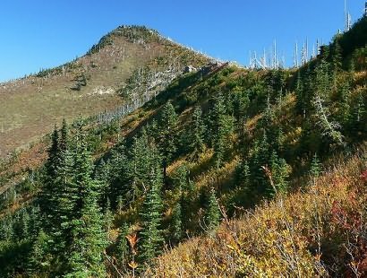 At this point, the trail begins its descent to Deadman Lake. About half way down the ridge, the trail enters a dense young forest.