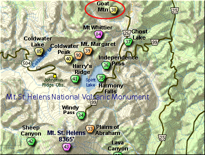 The trail follows westward along the south side of the ridgeline of Goat Mountain. There is a visible users trail to the top of Goat Mountain, but this CD does not cover that. As your walk west on this trail Mt St Helens becomes hidden by the Mt Margaret formation that lies between Mt St Helens and the Green River Valley below you.