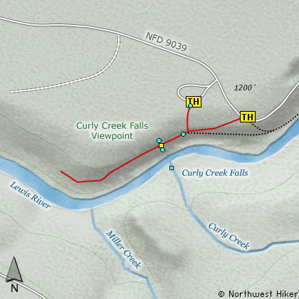 Curly Creek Falls is viewed from above the Lewis River at a viewpoint just a short walk from the parking area. In season this view is spectacular, but in late fall, Curly Creek can dry up, leaving no water in the falls.