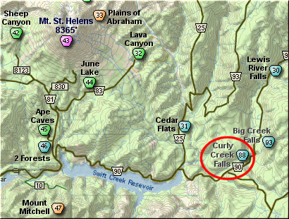 If however, you plan to approach this hike from the Columbia River Gorge area, then begin at Carson, Washington and head northwest on the Wind River Hwy. In 7.5 miles you will pass through the little community of Stabler, and in another 5.8 miles you will come to the junction of Forest Road 30. Turn right onto FR30 and follow this road for 13.2 miles north along the Wind River and then up a steep incline and onto a plateau where you will come to the junction of the Curly Creek Road. Turn left onto the Curly Creek Road and follow it downhill past an excellent view area for about 5.1 miles until you come to Forest Road 90. Turn right onto FR90 and follow this road for another mile and you will come to the junction of Forest Road 9039. Make a sharp downhill left turn onto FR9039 and follow it for almost another mile down across the Lewis River and the trailhead parking will be on your left.
