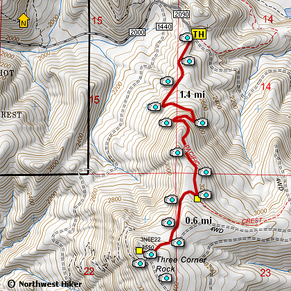 the most gentle and brief. The trail to Three Corner Rock is the Pacific Crest