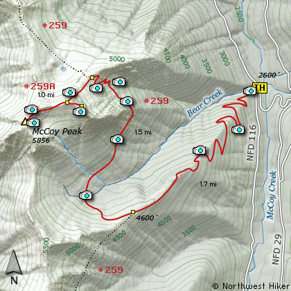 This hike is one of the steepest hikes I've ever encountered. In the first mile and a half you gain almost 2000 feet. There are lots of switchbacks, about 8 major ones in the first mile. The hike is in dense young forest for the first 1.5 miles.