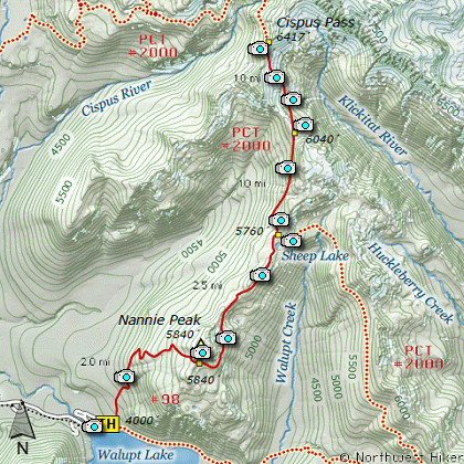 At about 2 miles the trail passes over the crest of a spur ridge of Nannie Ridge and one can hike directly to the top of Nannie Peak from this point. However, you continue to follow Trail #98 to go to Sheep Lake or the junction to the Pacific Crest Trail #2000.
