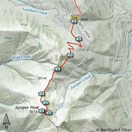 saddle where you will see the Juniper Ridge trail crossing SR2904. Park here to hike