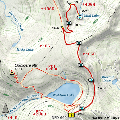 As soon as you cross the railroad tracks, bear left and follow the signs to Lost Lake. This paved road becomes Forest Road 18, and you need to follow it about another 5 miles. Then bear right on Forest Road 13 for another 4 miles. Again, bear right on Forest Road 1310. Forest Road 1310 gets a bit narrow in places, especially where it is exposed to the south. Be extremely cautious while driving this section of the road and stay away from the cliff side. Continue on FR1310 for about another 6 miles to the trailhead parking area at Wahtum Lake. This is the trailhead for several hikes.