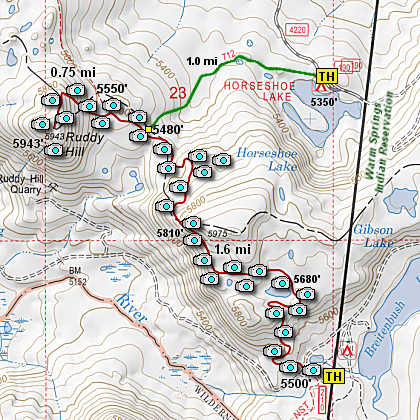 After passing the trail to Horseshoe Lake, it is only a quarter of a mile of less to the trial that takes you up Ruddy Hill. As you walk north on the PCT, the trail up Ruddy Hill is on your left and marked with a sign attached to a tree.