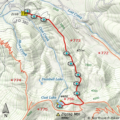 This challenging hike begins with a very steep climb through dense forest for about a mile. Then the trail levels off for about a mile before it begins its upward climb to an open ridge that offer spectacular views of Mt Hood, Mt Adams, and Mt Rainier. At 3.5 miles the trail intersects trail #775 and follows this trail for about a quarter mile. Then trail #796 takes you to Cast Lake. As you near the lake, the trail divides. Going to the right takes you to the far north end of the lake and decent camping areas. The trail to the left brings you to the south end of the lake with no appropriate places to camp.