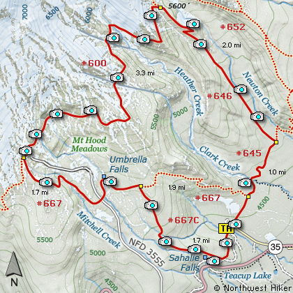 Map of the Umbrella Falls, Sahalie Falls, Mt Hood Meadows Hike
