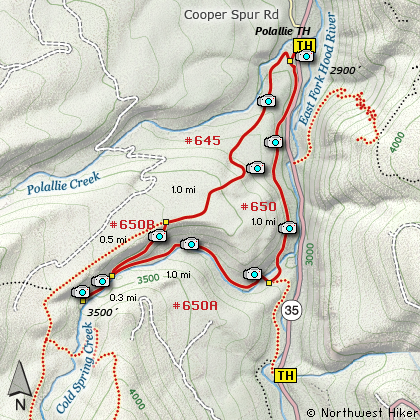 Cold Spring Creek and follows the East Fork of the Hood River back to the Polallie Trail head.