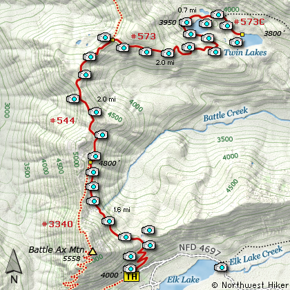 About 65.4 miles south of Estacada or 4.5 miles north of Detroit, turn on Forest Road 4696. Go northeast for about .7 miles, and just after you cross over a creek, bear left onto Forest Road 4697. Follow FR 4697 the 7 miles to the Campground turnoff at the west end of Elk Lake. Continue past the campground about a quarter mile and the road ends due to a washout. In that quarter mile you will pass the trail that leads to Twin Lakes and other points north. The trail to Battle Ax Mountain continues along this road beyond the point of closure.