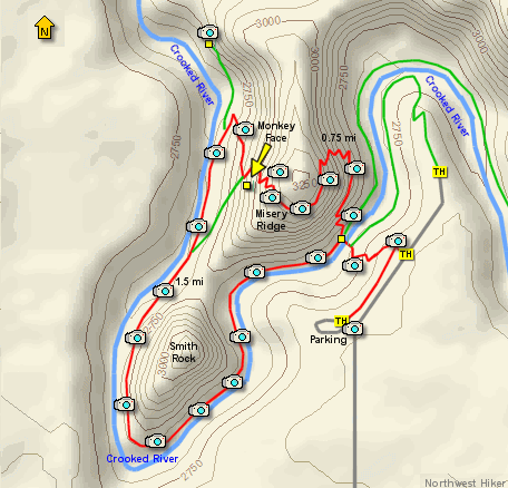 It is about a mile and a half to the base of Monkey Face, which is a 400 foot verticle spire. You then can climb through a series of well placed switchbacks to the top of Misery Ridge. From there you can complete your loop hike by following the trail back down to the bridge where you began the loop.