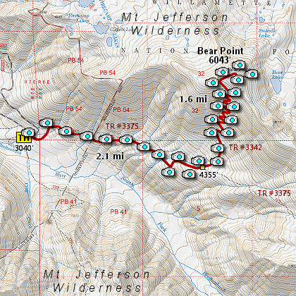 As the trail climbs over 1700 feet in about a mile and a half, you will be treated to spectacular views of Mt. Jefferson and other peaks to the south. When you reach the summit of Bear Point, you will also be able to see Mt. Hood to the north.